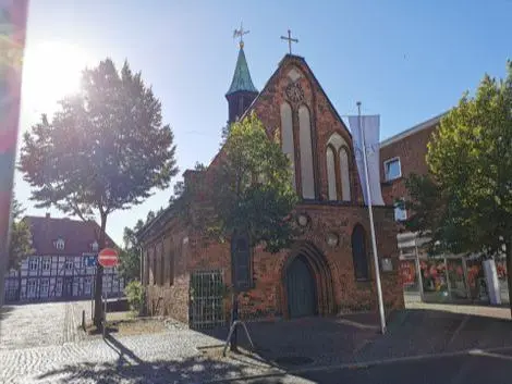 Dem Betrachter des einschiffigen Backsteinbaus fällt sogleich der große, zur Lüneburger Straße zeigende Giebel ins Auge, der als Blendarchitektur vor das Gebäude gesetzt ist und deutlich über die Dachlinie hinausragt. Das eindrucksvolle Eingangsportal ist durch Formziegel eingefasst und wirkt, neben zwei gotischen Fenstern sowie Putzelementen, als Blickfang in der zur Straße gerichteten Fassade. 1476 wurde bei einer Erneuerung neben der Blendarchitektur auch ein fünfseitiger Chor angefügt, in dessen Fenstern heute die Glasmalereien aus der St.-Viti-Kapelle zu bewundern sind. Der nachträglich angesetzte, vergrößerte Chor auf der Ostseite lässt sich leicht an dem unterschiedlich hohen Dachansatz ausmachen.