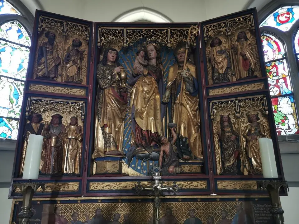 Die äußeren Malereien des doppelten Wandelaltars sind verloren. Den Schrein füllen die Figuren einer Mondsichelmadonna sowie